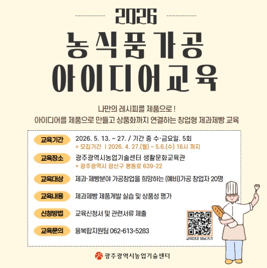 김시라 농업기술센터소장은 “이번 교육은 아이디어를 실제 상품으로 구현하는 전 과정을 경험할 수 있는 창업 실습형 프로그램”이라며 “향후 개관 예정인 농식품가공창업보육센터와 연계해 교육부터 실습, 창업으로 이어지는 체계를 구축하겠다”고 말했다.