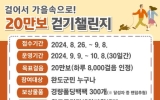 목포 온라인뉴스팀2024. 08.28[뉴스앤저널]완도군은 걷기 좋은 계절 가을을 맞아 생활 속 걷기를 활성화하고자 ‘걸어서 가을 속으로! 20만 보 걷기 챌린지’를 진행한다. 챌린지는 9월 9일부터 10월 8일까지 30일간 진행되며, 기간 내 20만 보 걷기(하루 8,000보 인정)를 달성하면 된다. 20만 보 달성자 중 추첨을 통해 300명에게 보상 물품(경량 폴딩 백 팩)을 지급한다. 참여 방법은 ▶워크온 앱 설치 ▶완도군 커뮤니티 ‘너DO 나DO 건강한 걷기 운동’ 가입 ▶걸어서 가을 속으로! 20만 보 걷기 챌린지 '예약하기' 또는 '참여하기'...