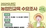화순 온라인뉴스팀2024. 08.19[뉴스앤저널]화순군은 2025년도 농업인 교육과정 개설에 앞서 농업인의 의견을 적극 반영하기 위해 8월 19일부터 9월 20일까지 5주간 농업인 교육 수요조사를 진행한다고 밝혔다. 현재 화순군농업기술센터는 지역특화작목 정착과 전문농업인 육성을 목표로 장기교육인 농업인대학과 단기교육인 전문농업기술교육, 정보화교육, 농업기계교육 등 다양한 과정을 운영하고 있다. 이번 수요조사는 온라인 및 방문을 통해 참여할 수 있으며, 온라인은 농업기술센터 누리집(농업기술센터)과 홍보 현수막에 표기된 QR코드를 통해 가능하고, 농업기술센터 및 읍...
