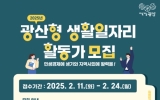 스포츠 온라인뉴스팀2025. 02.16[뉴스앤저널]광주 광산구가 지속 가능한 일자리 생태계 조성과 민생경제 회복을 도모하기 위한 일자리 사업 참여자를 모집한다. 모집 분야는 △생활민원 해결 △마을 일손 도움 △공공시설 운영지원 △공공사업 인력 지원으로 구성됐다. 광산형 생활일자리 활동은 생활민원 해결, 공공사업 인력 지원 등 총 37개 사업에 참여하며 광산구에 거주하는 미취업자를 대상으로 3월부터 6월까지 4개월 동안 활동할 150명을 모집한다. 참여 수당 일부는 온누리상품권으로 지급한다. 신청 방법은 24일까지 광산구청 각 일자리 담당 부서에 방문해 접수하면 된...
