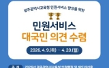 목포 전대상 기자2026. 04.09[뉴스앤저널]광주시교육청은 민원서비스 품질 향상을 위해 오는 9~20일 국민권익위원회 온라인 정책참여 플랫폼 ‘국민생각함’과 ‘시교육청 누리집’을 통해 대국민 의견을 수렴한다. 이번 의견 수렴은 국민의 다양한 목소리를 민원행정과 제도개선에 반영해 광주교육 민원서비스 만족도를 높이기 위해 추진됐다. 의견 수렴 내용은 ▲민원서비스 향상을 위한 제도 개선 ▲민원실 편의시설 및 환경 개선 ▲기타 민원서비스 이용 시 불편사항 및 개선 아이디어 등이다. 지난해 실시한 ‘2025년 민원서비스 개선 대국민 의견수렴’에는 595명의 국민이 ...