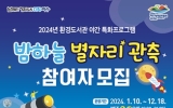 여수 최준규 기자2024. 01.09[뉴스킹]여수시 환경도서관은 주 2회 야간 특화프로그램으로 ‘밤하늘 별자리 관측’을 운영한다고 9일 밝혔다. ‘밤하늘 별자리 관측’은 시민들에게 이해하기 쉬운 별자리 교육과 천체관측 체험으로 구성, 환경도서관 강의실 및 옥상천문대 등에서 매주 수·금요일 저녁 7시부터 9시까지(하절기 7시 30분부터 9시 30분까지)까지 운영된다. 여수시민 누구나 참여할 수 있으며 개인은 시립도서관 홈페이지에서 관측 희망일 1일 전까지, 단체는 별도 참가신청서 제출로 1주일 전까지 신청하면 된다. 기타 자세한 사항은 시립도서관 홈페이지에...