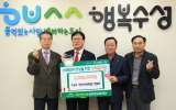 의회 최준규 기자2024. 01.01[뉴스킹]군제1미사일방어여단 군무원단는 지난달 28일 이웃돕기 성금 40만원을 대구 수성구청에 기탁했다. 12명으로 구성된 공군제1미사일방어여단 군무원단은 생활이 어려운 이웃을 위해 함께 성금을 모았다고 밝혔다. 수성구는 기탁받은 성금을 희망수성 천사계좌에 적립한 후 저소득층을 위한 필요사업에 사용할 예정이다. 김대권 수성구청장은 “어려운 이웃을 위해 따뜻한 마음을 나누어 주셔서 감사드리며, 기탁하신 성금은 저소득층을 위한 사업에 소중히 사용하겠다”고 말했다.