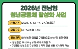 영광 전대상 기자2026. 04.13[뉴스앤저널] 영광군은 청년들의 지역 활동 기반을 마련하고 지역사회 활동 주체로 성장할 수 있도록 지원하기 위해 오는 4월 27일까지 ‘2026년 전남형 청년공동체 활성화 사업’ 참여팀을 모집한다고 밝혔다. 이번 사업은 총 6개 팀을 선정해 팀별로 600만 원의 활동비를 지원하며, 발대식과 성과공유회, 네트워크 행사 등 다양한 교류 프로그램도 함께 운영될 예정이다. 신청 대상은 청년 5인 이상으로 구성된 팀·법인·단체이며, 모집 분야는 ▲지역연계 ▲일자리·창업 ▲문화·예술 ▲봉사활동 등 4개 분야다. 지역사회에 새로운 활력을...