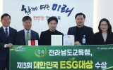 완도 온라인뉴스팀2024. 12.18[뉴스앤저널]전라남도교육청이 17일 서울 성동광진교육지원청에서 열린 아름다운학교운동본부 주관 ‘제3회 대한민국 ESG 대상 시상식’에서 ESG 확산 공로를 크게 인정받아 대상인 환경부장관상을 수상했다. 이날 시상식에서는 전남교육청을 비롯해 ESG 경영 문화 확산에 기여한 17개 기관이 상을 받았다. 주민직선 4기 공약에 따라 전국 교육청 최초로 ESG를 도입한 전남교육청은 지난해 ▲ ESG 지원센터 구축 및 도입계획 수립 ▲ ESG 교육 및 실천 조례 제정 ▲ ESG교육발전위원회 구성을 통해 기반을 마련했다. 올해는 ▲ ES...