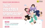 전라남도 온라인뉴스팀2025. 03.12[뉴스앤저널]전라남도는 청년의 문화·여가 활동을 지원하는 ‘청년 문화복지카드’ 신청자를 6월까지 상시 모집한다고 밝혔다. ‘전남청년 문화복지카드’는 청년의 문화 향유 기회를 넓히고 자기 계발을 돕기 위해 2022년부터 시행하고 있다. 전국 최초로 소득 기준 없이 청년에게 문화복지비를 지원하는 정책이다. 청년이 공연 관람, 학원 수강, 도서 구입, 체육시설 이용 등 다양한 문화·복지 혜택을 받을 수 있다. 지원 대상은 2023년 3월 4일 이전부터 전남에서 2년 이상 주소를 두고 거주한 19세 이상 28세 이하(1997~2...